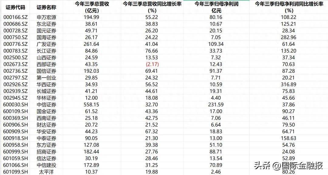 此外,华泰证券、广发证券、中国银河和中金公司等券商的业绩也实现了增长,前三季度总营收均突破200亿元。